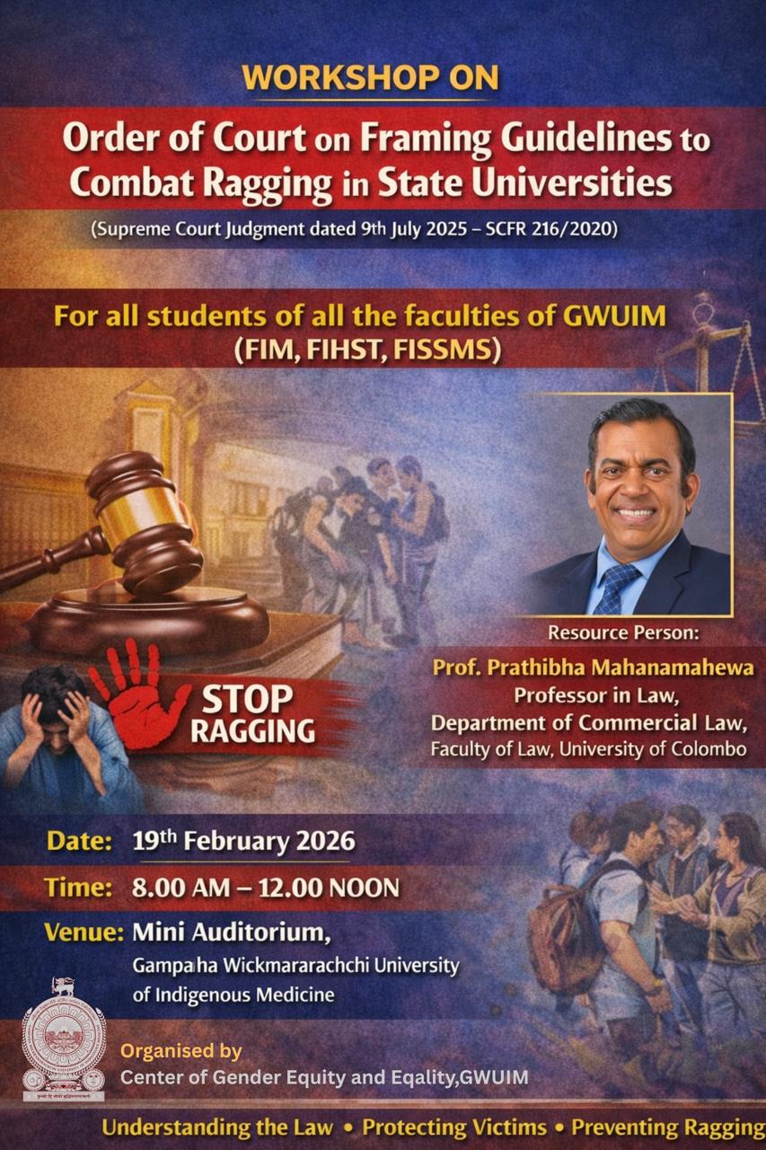 The Center of Gender Equity and Equality (CGEE), Gampaha Wickramarachchi University of Indigenous Medicine, is organizing a workshop on the Order of Court on Framing Guidelines to Combat Ragging in State Universities, based on the Supreme Court judgment dated 9th July 2025 (SCFR 216/2020).